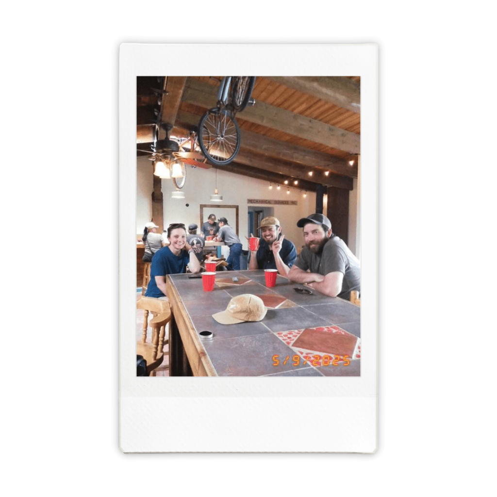 On the Friday before the race, we met at the Hub, a new bike shop in Salmon, ID, for the pre-race social. It was great to have our friend Ana come from Boise with her team for her first attempt at 9.5 hours of disco. Morgan snapped this photo with her cool Fuji Instax digital cam.